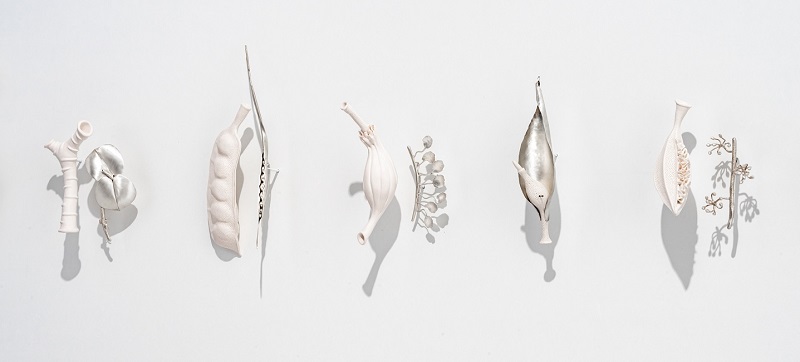 Images: 2021 Award Winner Sarah RAYNER and Sophie CARNELL / Florilegium… traversing the poetry of plants 2020 (detail) / 42 brooches: hand carved porcelain with terra sigillata, sterling and fine silver / 26 x 375 x 8cm / Toowoomba Regional Art Gallery - Toowoomba City Collection 2387 / Purchased from Contemporary Wearables ’21 with funds donated by Toowoomba Gallery Society 2018 / © Sarah Rayner and Sophie Carnell